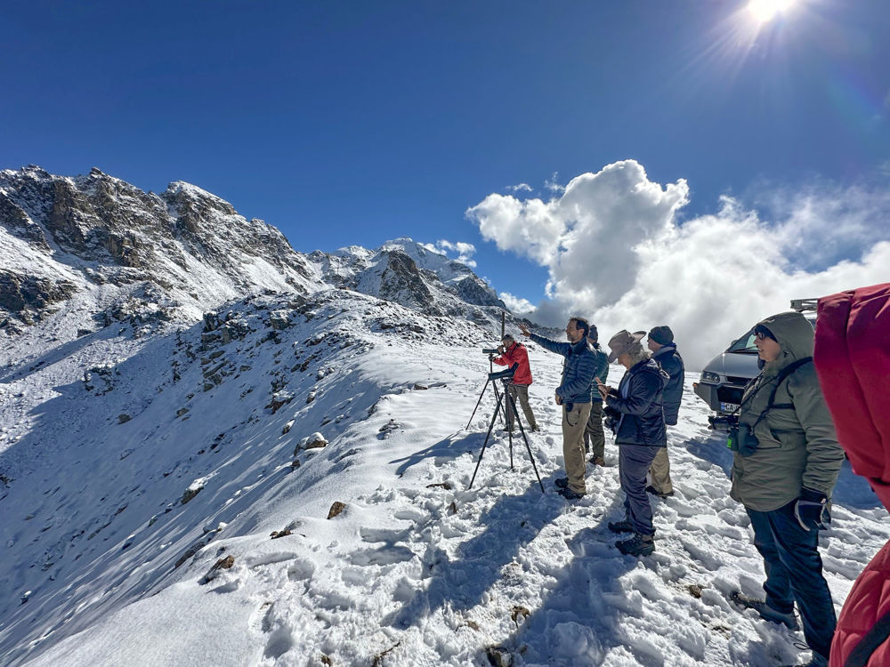 During our time in Svaneti, we visited Mt. Tetnuldi three times, twice climbing the summit to 10,000 ft. Along the forested road up to the tree line, we caught up with Kruper’s Nuthatch, Red Crossbill, Goldcrest, Hawfinch, Black Woodpecker, and countless Caucasian Mountain Chiffchaffs. And while we heard Caucasian Snowcocks during our first vigil at the summit, the snow covering the slopes made it cold and the ground cover challenging. It wasn’t until our second climb that we finally saw a group of ten Snowcocks wheeling on the wing to descend on a slope where we could appreciate them at length!