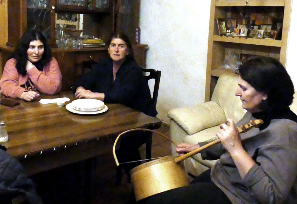 Our musical encounters in Svaneti, a region with its own, archaic flavor of polyphonic tradition, were standouts. First we saw Vaho Pilpkhani and his Riho Ensemble perform in full garb, a series of Svanetian worship songs, round dances, and bringing in audience participation. However, it was our visit to the Chamguliani family in Lakhushdi that was most memorable, as we enjoyed an intimate dinner of traditional Svanetian food, accompanied by the voices of the three sisters that hosted us and the haunting sounds of their Chuniri viol.