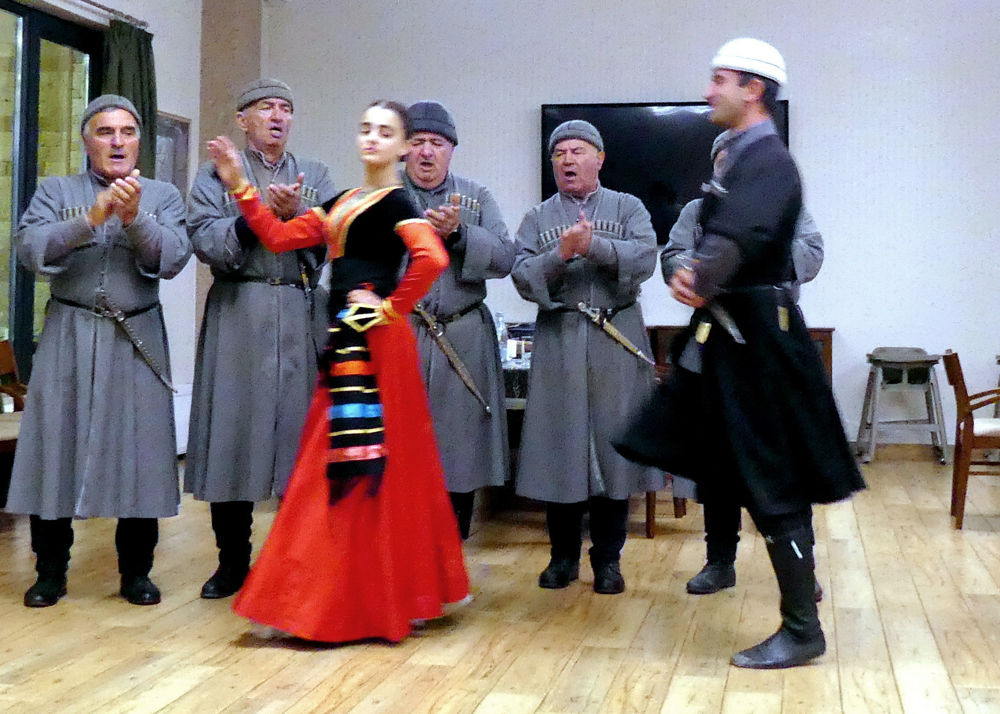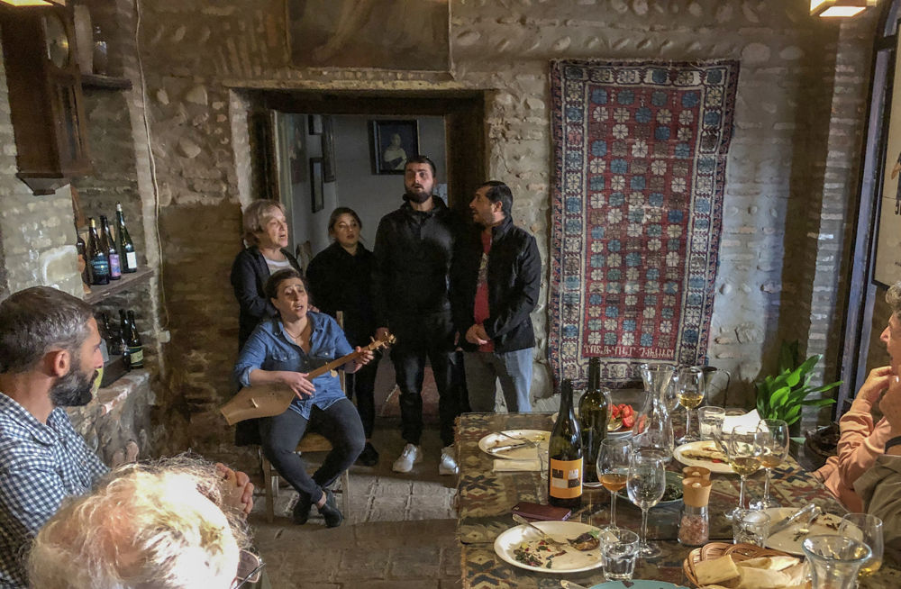 We continued eastward to Sighnaghi, a fortified town perched atop the ocean-like Alazani Valley, overlooking the Greater Caucasus. At the Pheasant's Tears restaurant, a private room awaited with more wines and spreads. Four members of the Zedashe Ensemble sang and performed for us polyphony from Kakheti, with its eastern flare, and lullabies from the western region of Mingrelia. The wines included Kakhuri Mtsvivani and Chkhaveri, which surprised our palates.