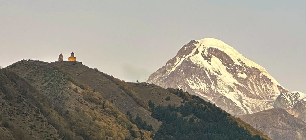 Gergeti Trinity Church and Kazbeg by Bob Warren