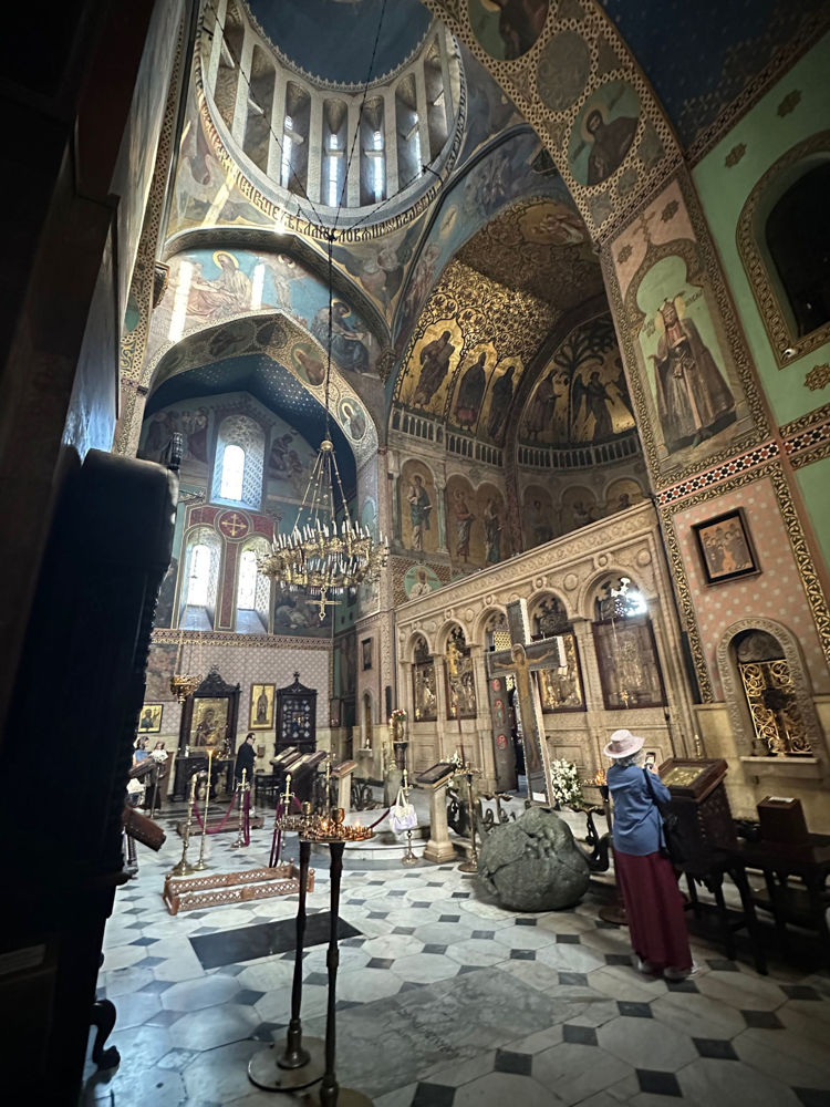 As we returned towards Tbilisi, we made a final stop at the ancient capital of Mtskheta for our final meal together, a hearty lunch accompanied by Rkatsiteli and Saperavi. We compiled our final list and favorite experiences of the tour and rounded up with a performance of a sacred Svanetian chant by three members of the tour—both tour leaders and Bob! We strolled to the impressive Stetitskhoveli Cathedral before returning to Tbilisi.