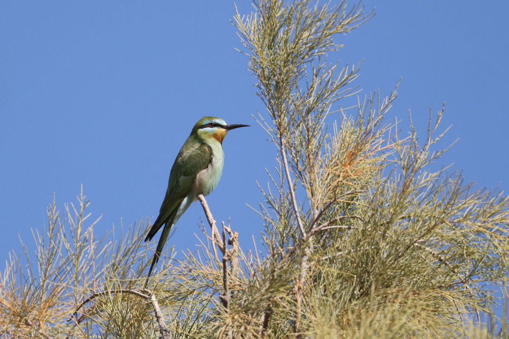 A long journey day through the deserts on the way to Ouarzazate allowed for a few quick birding stops. A great sighting was a small flock of Black-bellied Sandgrouse in some arid fields. We noted our first Black Wheatears in the mountains and White-crowned Wheatears in the deserts. A fortuitous find in a rocky canyon along a curvy road was Barbary Partridge; we also notched our first Desert Lark in the scenic canyon where Oleander is native. On the outskirts of Ouarzazate we birded some scrubby areas and found our first and best sighting of the beautiful Blue-cheeked Bee-eater perched in Tamarisk with several migrant warblers hopping around in the trees below.
