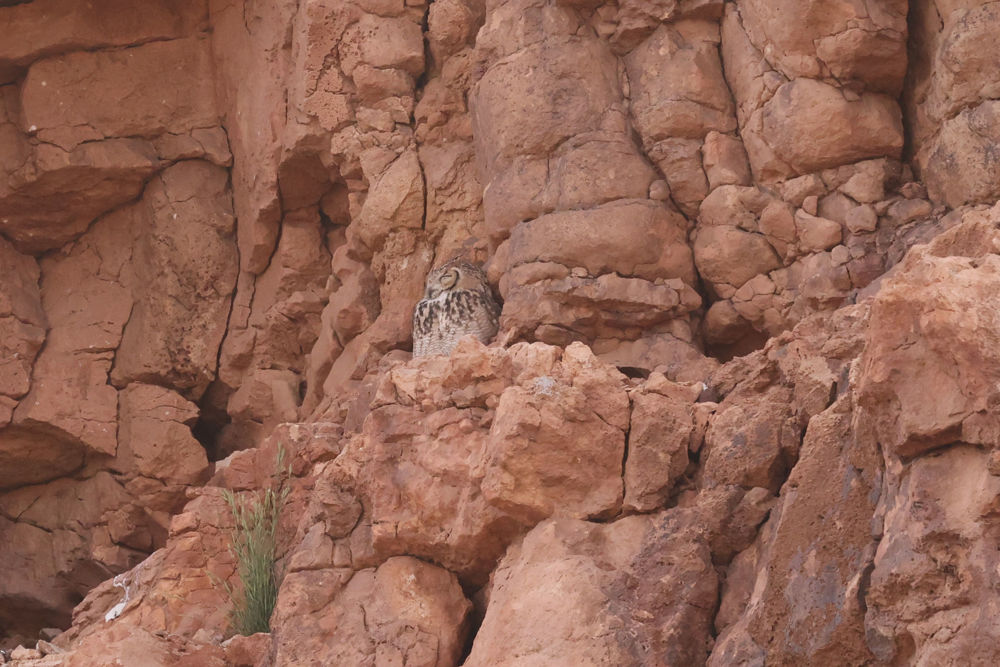 Common Chiffchaff, Willow Warbler, and Western Bonelli’s Warblers were all on a break from their northward migrations to Europe for the summer. We also noted hundreds of White Storks soaring up in kettles winging their way north, too. Nearby at the Mansour Reservoir we found an acacia full of fledgling Great Gray Shrikes with their parents making food deliveries as we watched. Perhaps the most exciting sighting was the Moroccan Spiny-tailed Lizard Ossama spotted on the roadside while we were distracted by birds! This gorgeous large lizard was peachy-orange with a fat spiky tail. In the evening, we drove out into the rocky desert near Boumalne Dades; a special outing would soon unfold for us. Hasam, a local guide, first walked us to a large flat rock that he delicately lifted, revealing the best reptile of the trip, a Saharan Horned Viper! Then he led us into the wadi with 100-foot-tall cliffs hemming us in. In a little notch, a somnolent Pharoah Eagle-Owl watched over her wide-eyed chicks tucked into an alcove in the red sandstone cliffs—another trip highlight.