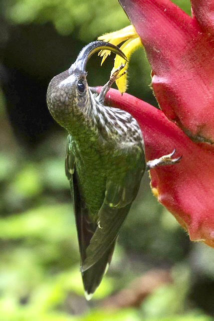 Our arrival at Canopy Lodge could not have had a better surprise. Perched under the Heliconia bushes, that have been planted specifically to attract it, was the very tough-to-find White-tipped Sicklebill. We would see this species again at this location during our stay here. That curved bill has evolved to fit into the decurved yellow flowers and allow the tongue to reach the nectar.