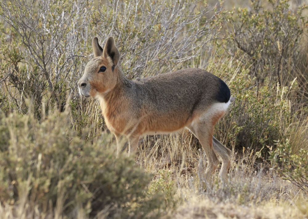 Over the next two days, we had a real blast exploring the fascinating coastal region of the Valdes Peninsula, a UNESCO World Heritage Site that is home to unique birds and mammals. A fabulously calm day greeted our boat excursion on the bay, where we enjoyed amazingly close studies of endangered Southern Right Whales, including a female and calf, as well as the much-wanted Snowy Sheathbills. The desert held several comical Patagonian Mara, while beaches were home to giant snorting Southern Elephant Seals in molt. The cute Patagonian Cavy touched our hearts. A carefully constructed wooden boardwalk gave us access to a colony of countless thousands of Magellanic Penguins, a sight just as awe-inspiring as our mega-close studies of a pair of the endemic White-headed Steamer-Duck.