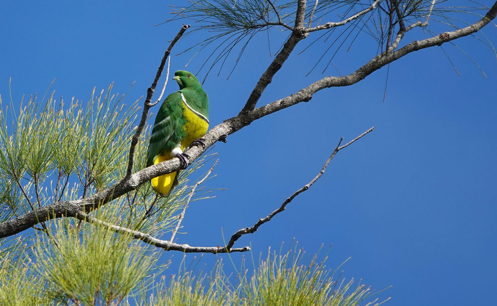 Back in the carpark, the birds kept coming, with a couple of gorgeous and inquisitive Yellow-bellied Flyrobins, as well as a friendly Southern Shrikebill and a pair of Melanesian Flycatchers. A quick check of the giant kauri again proved fortuitous, as a pair of the strange Horned Parakeets were spotted feeding above us. We enjoyed a wonderful packed lunch, with fresh salads and baguettes, coffee, and cookies—all the while being watched intently by several Yellow-bellied Flyrobins snatching up crumbs. A short walk down the road after lunch yielded great looks at the truly huge New Caledonian Imperial-Pigeon, as well as stunning New Caledonian Myzomela, Gray Fantail, roving groups of Green-backed White-eyes, and a showy male Melanesian Flycatcher. We then staked out a nearby flowering tree for the rare Crow Honeyeater, but despite our long vigil, no bird appeared. Leaving the park, we stopped for several Whistling Kites nesting in dead trees, and had better looks at Dark-brown Honeyeater.