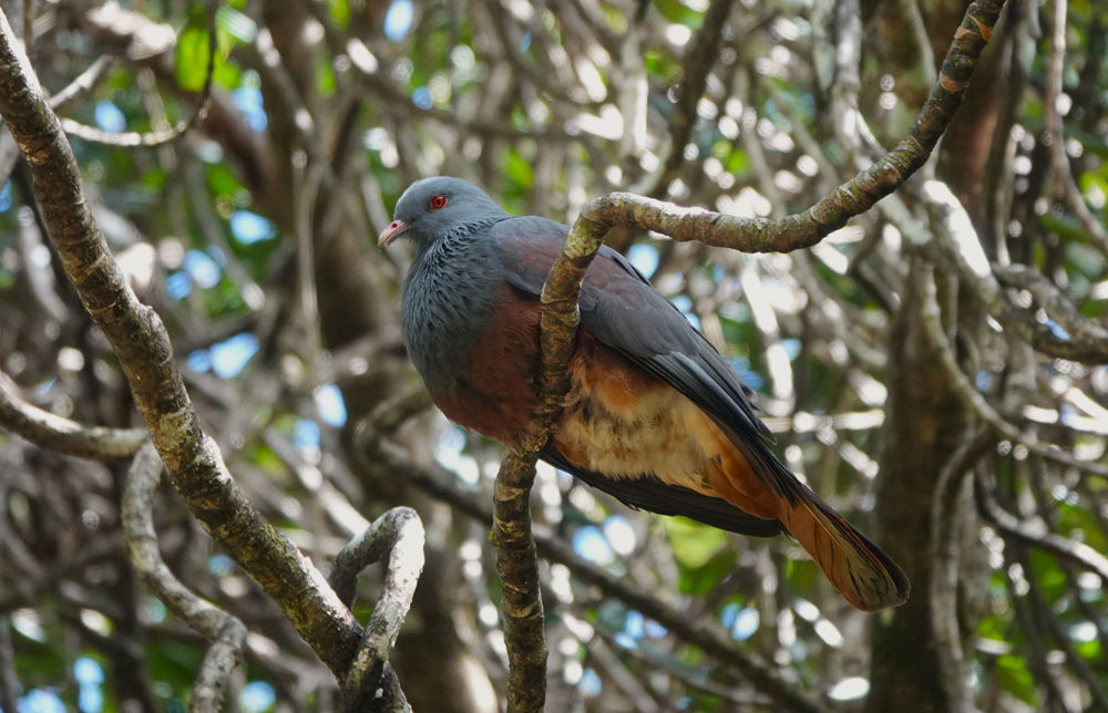 Our second full day dawned with beautiful weather once again, and we headed north along the western coast in the direction of La Foa and the nearby Parc Provincial des Grandes Fougeres. We had a productive morning birding along the road towards the park, where fruiting trees and seeding grasses yielded a number of new species—Pacific Emerald Dove, South Melanesian Cuckooshrike, Long-tailed Triller, New Caledonian Crow, Striated Starling, and several species of introduced finches. The highlight was undoubtedly a splendid male Cloven-feathered Dove—a strangely proportioned and uniquely colored endemic pigeon that gave wonderful looks. After entering the park itself we enjoyed morning tea looking over the verdant forests and impressive tree ferns. Afterwards, we took a very pleasant hike through the forest, where we had close looks at a great variety of the Caledonian endemics. One of the highlights were good views of several tool-using New Caledonian Crows using small sticks to probe into the trunks of several trees! After another excellent packed lunch, we began the drive back to Noumea, stopping along the entrance road again, where we scored a pair of gorgeous Red-throated Parrotfinches.